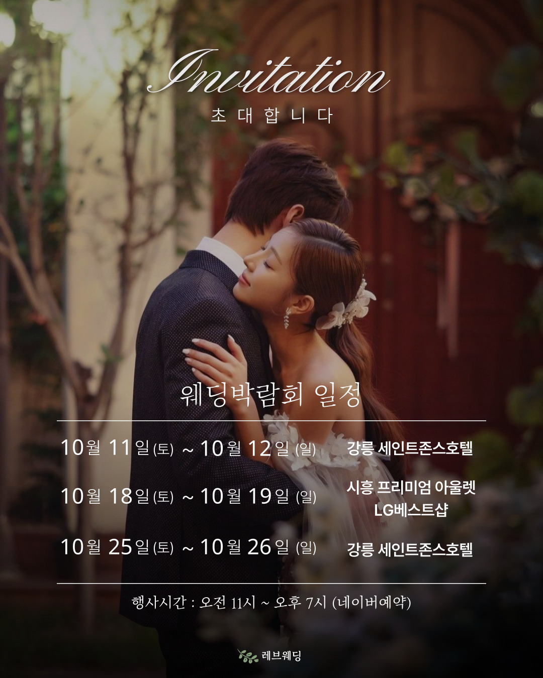 10월 11일(토) - 10월 12일(일) 강릉세인트존스호텔 웨딩박람회 (단독개최) 페이지 정보 작성자 레브웨딩 작성일 25-10-01 17:39 조회 7회 본문 관련링크 https://wedding.gandme.co.kr/gn1011/ 3회 연결 https://m.place.naver.com/place/1557099710/ 2회 연결 이전글10월 18일(토) - 10월 19일(일) 시흥프리미엄아울렛 2층, LG전자베스트샵 목록